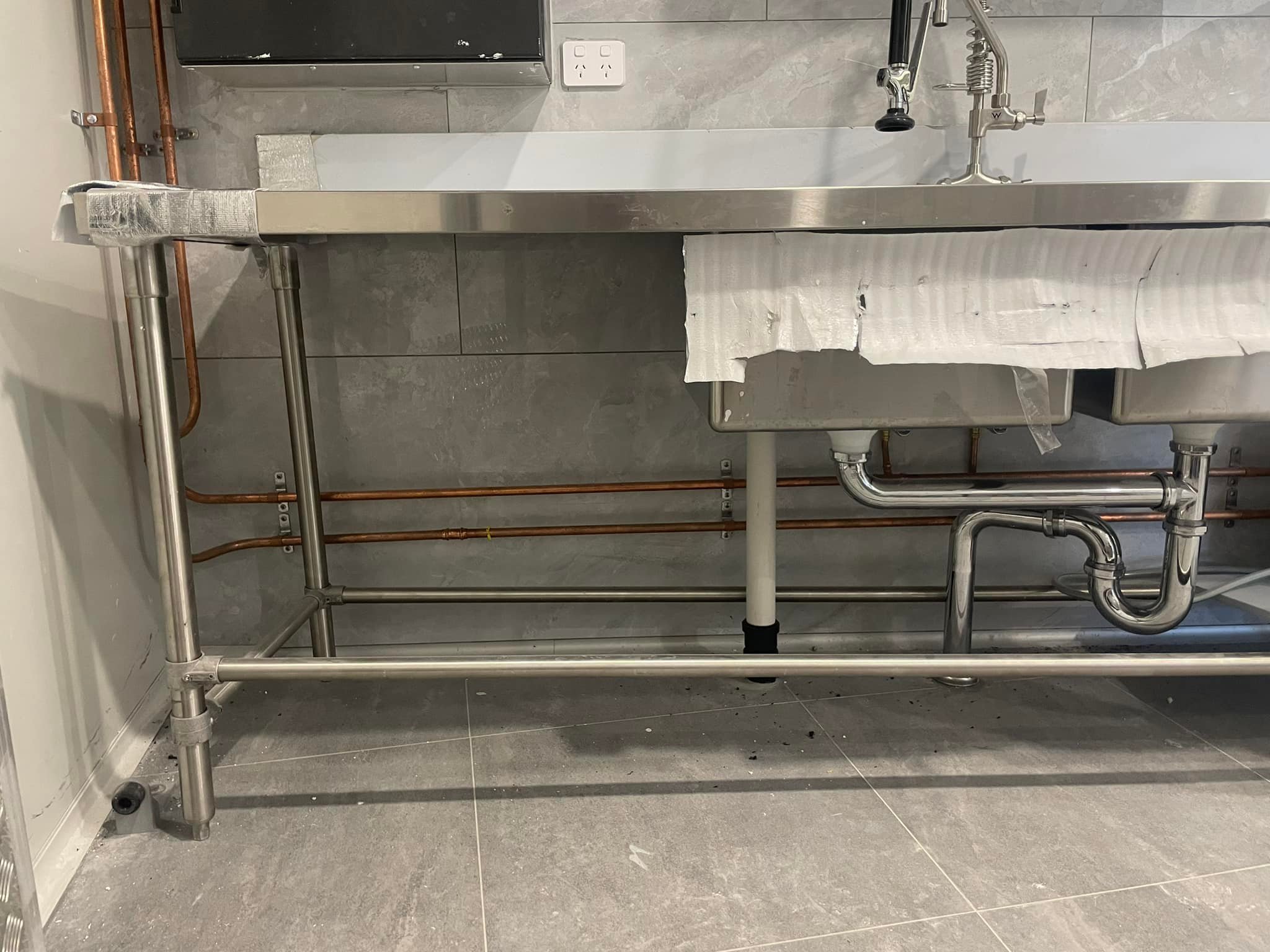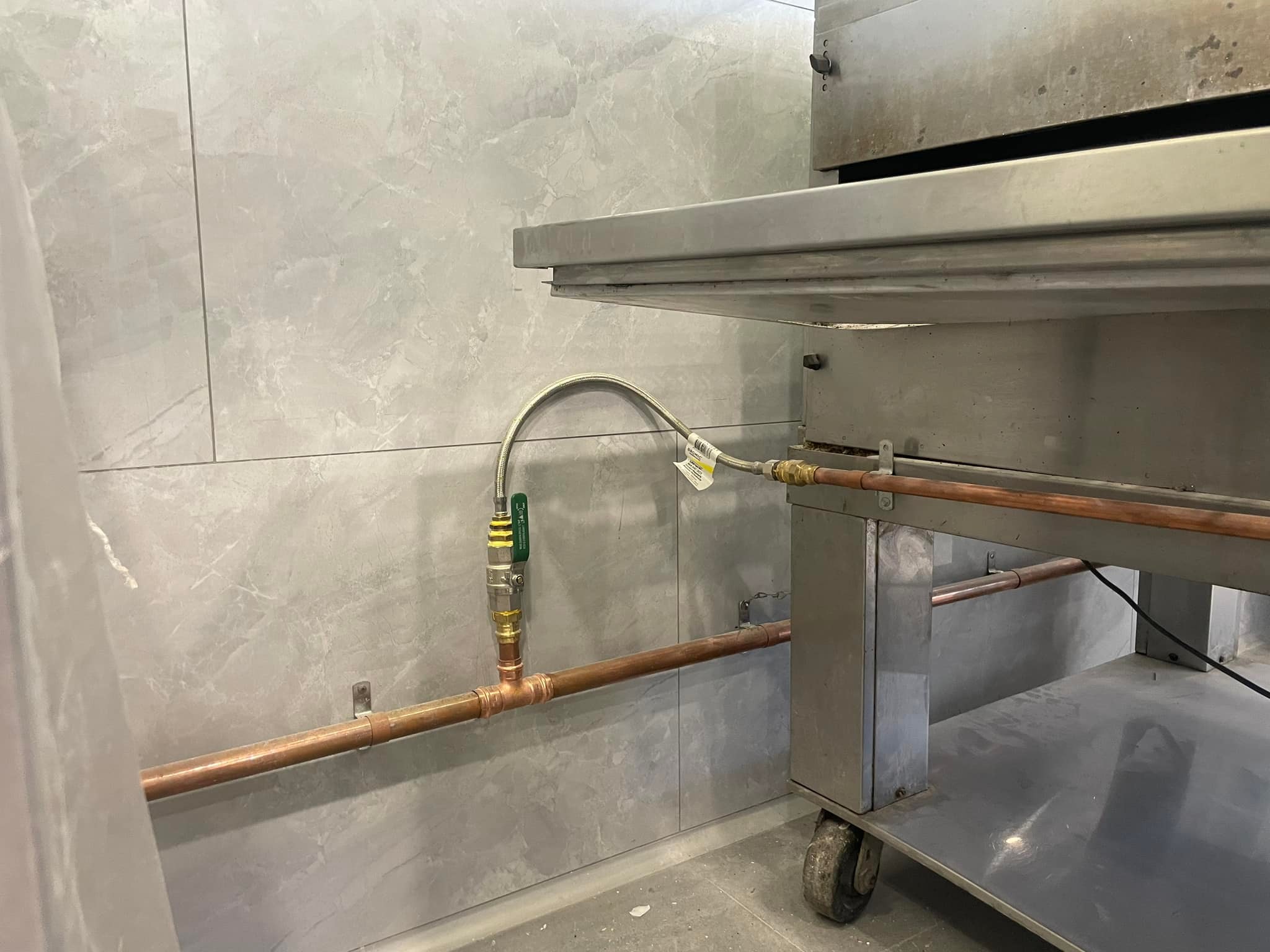 Our crew provided a complete water and gas fitout for the new commercial kitchen, installing all appliances, knee-operated basins, mop and food prep sinks, a solenoid valve, and handwashing stations.